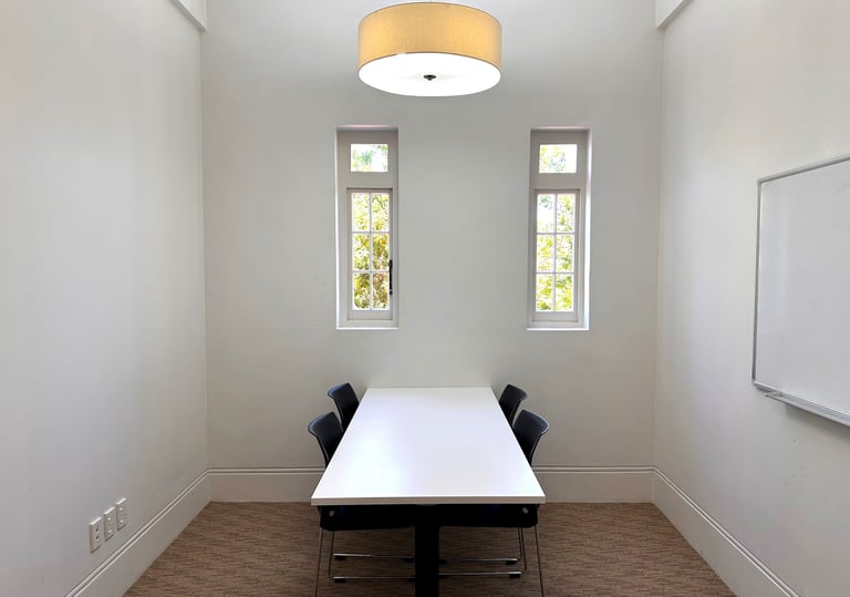 Located on level 1 of Lopdell House, the meeting room is an intimate space, perfect for small meetings of 2-6 people. The room has a large table and seating with a white board. Kitchen facilities adjacent to the space.