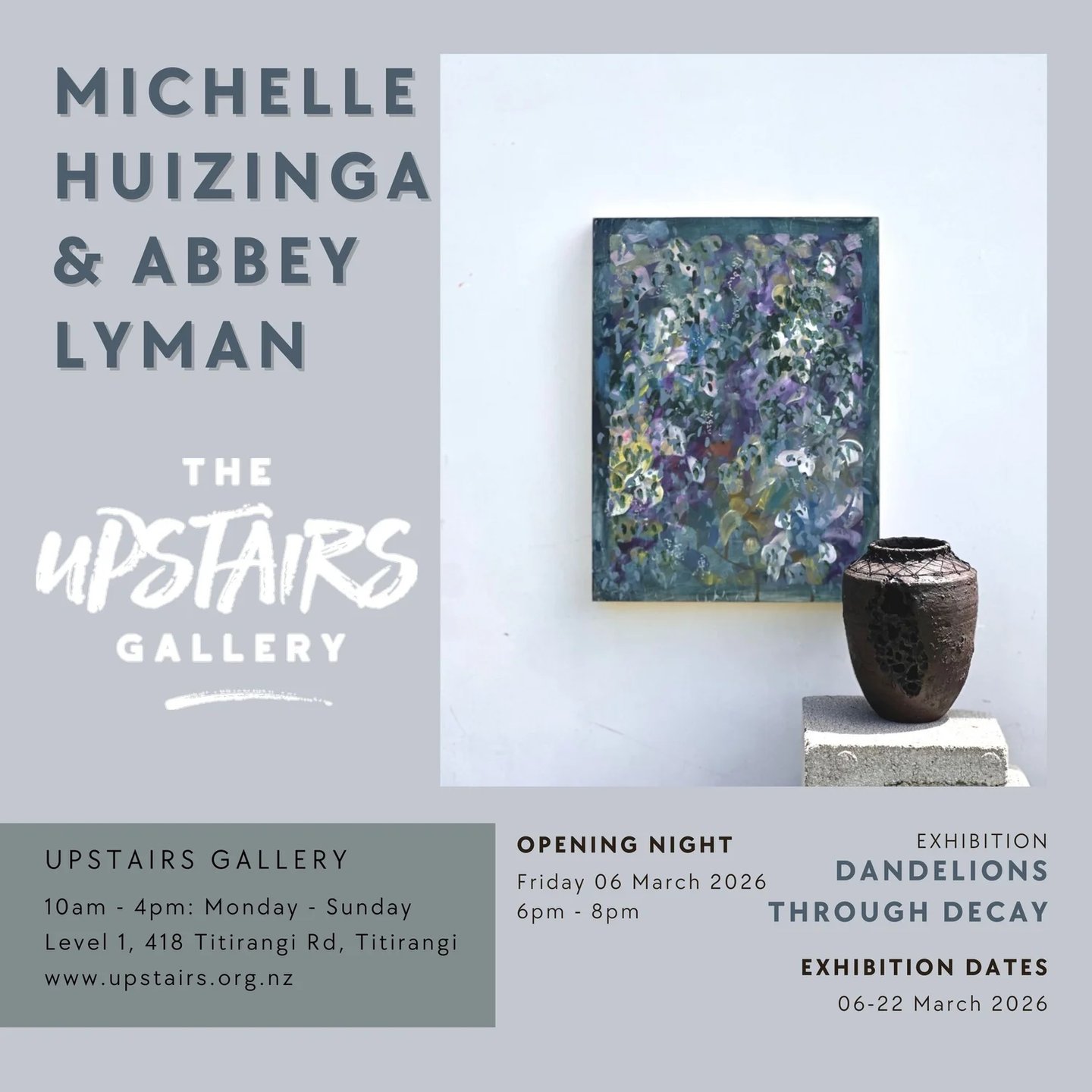 Email gallery@upstairs.org.nz with any enquiries or phone 09 817 4278